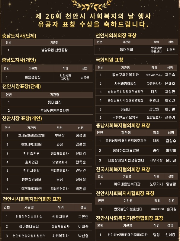 제 26회 천안시사회복지의 날 행사 유공자 표창수상 페이지 정보 작성자작성자 : 천사협 조회조회수 : 438회 작성일작성일 : 25-09-23 13:14 본문 수상을 축하 드립니다! 목록 다음글「제26회 천안시사회복지의 날 행사」사회복지 유공자 추천 협조 요청 25.07.28